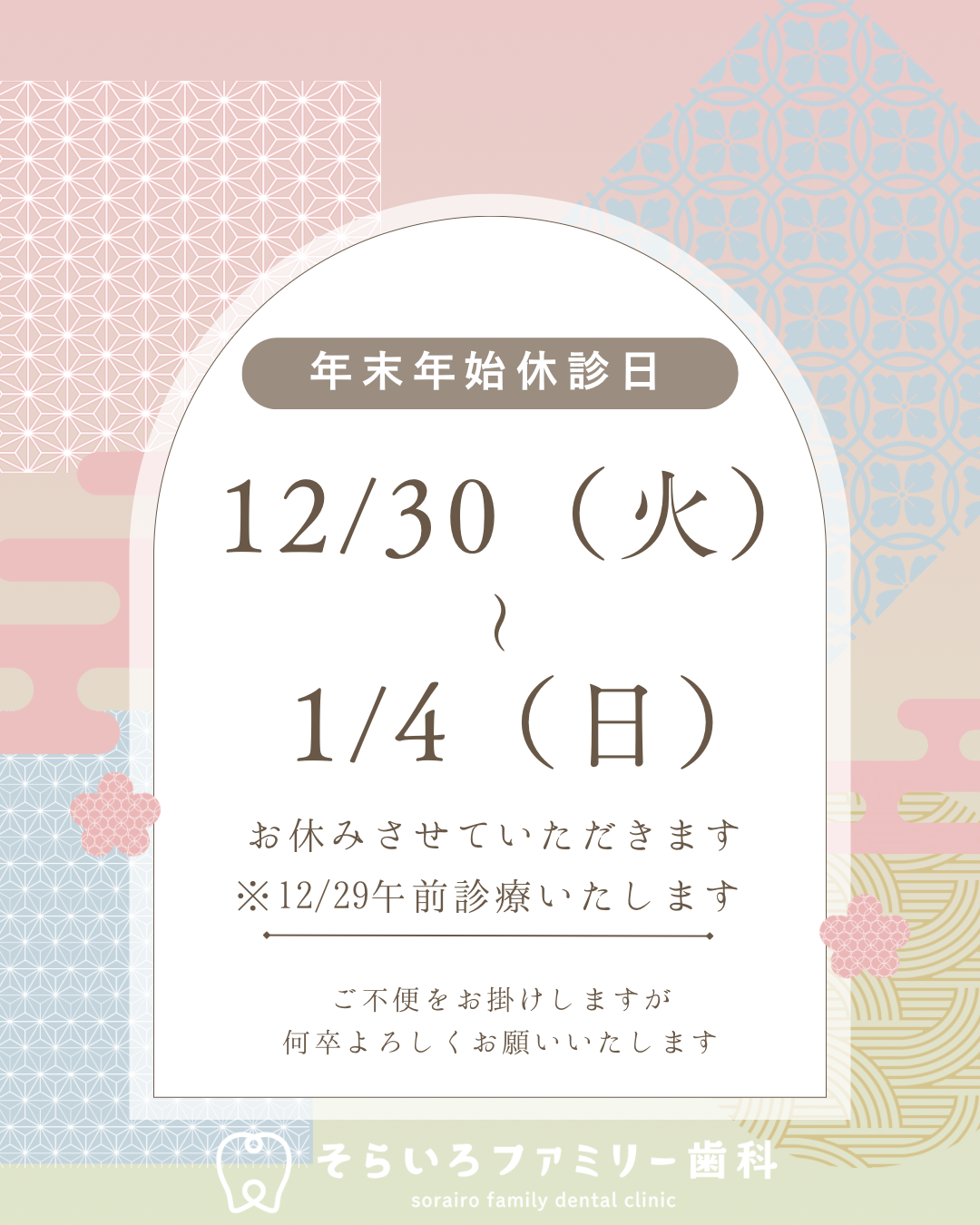 年末年始の休診は12/29(月)午後から1/4(日)までとなります。ご迷惑をおかけいたしますが、何卒ご理解くださいますようお願い申し上げます。